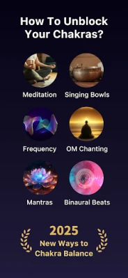 Aplikacja oferuje spersonalizowane medytacje prowadzące dla każdej z siedmiu głównych czakr. Poczuj moc uzdrawiających wibracji Muladhary (396 Hz, czerwień), poprzez kreatywność Svadhisthany (417 Hz, pomarańcz), pewność siebie Manipury (528 Hz, żółć), bezwarunkową miłość Anahaty (639 Hz, zieleń), klarowną komunikację Vishuddhy (741 Hz, błękit), intuicję Ajny (852 Hz, fiolet) aż po jedność Sahasrary (963 Hz, purpura). Każda sesja jest wzbogacona o pozytywne afirmacje, a głębokie doświadczenie medytacyjne zapewniają precyzyjnie dobrane rytmy binauralne (fale Delta, Theta, Alpha, Beta, Gamma), sprzyjające relaksacji, skupieniu i głębokiemu uzdrowieniu. Dodatkowo, uzdrawiające dźwięki tybetańskich mis śpiewających wspomagają redukcję stresu, wzmacniają kreatywność i przygotowują umysł do medytacji.