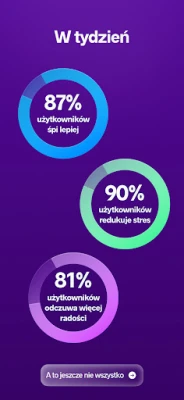 Szczególny nacisk kładziemy na regenerujący sen, który jest filarem codziennego funkcjonowania. Meditopia oferuje ponad 30 specjalnie skomponowanych medytacji nasennych oraz ćwiczeń oddechowych i wizualizacji, które pomogą Ci wyciszyć umysł i pożegnać się z bezsennymi nocami. Zamiast standardowych dźwięków relaksacyjnych, zanurz się w świecie baśni na dobranoc – opowieści nie tylko dla dzieci, które delikatnie ukołyszą Cię do snu. Odkryj bogatą bibliotekę kojących dźwięków natury, takich jak szum deszczu czy fal, a także biały szum, wszystko w przemyślanym trybie ciemnym, który chroni wzrok i sprzyja głębokiemu odprężeniu.